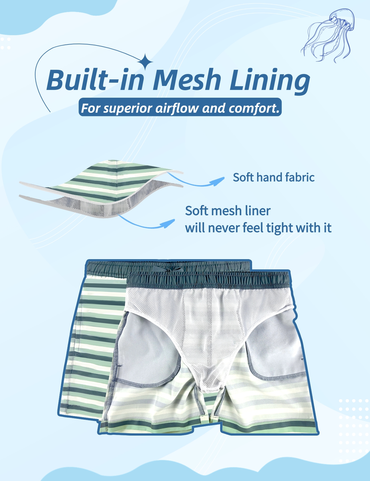 - Friendly Mesh Lining: Built-in soft stretch mesh liner brief enhances comfort.