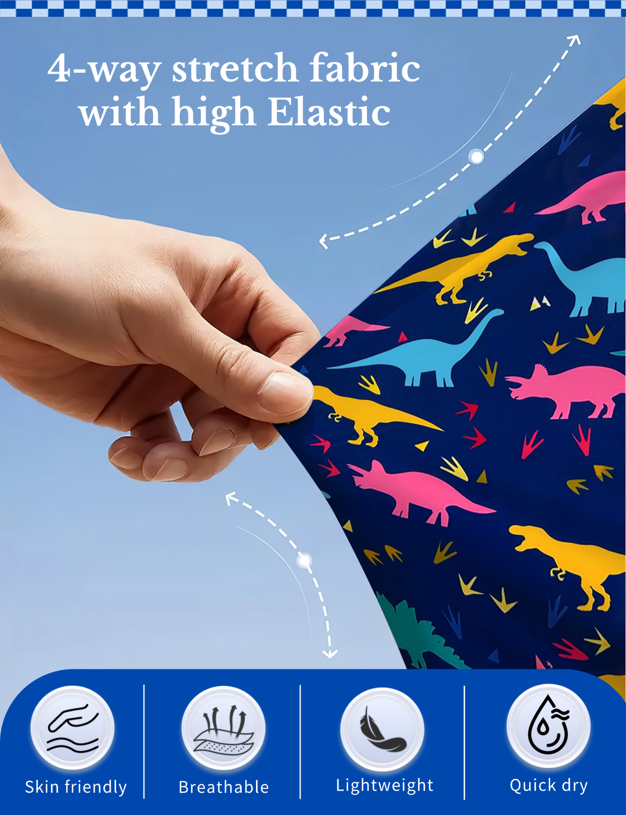 • Material: Boys swimsuit is made of 85% polyester and 15% spandex, which is elastic, lightweight, breathable, soft and comfortable. This fabric has low water retention and extremely quick drying. Kids won’t have that heavy, soggy feeling after leaving the pool or the beach.